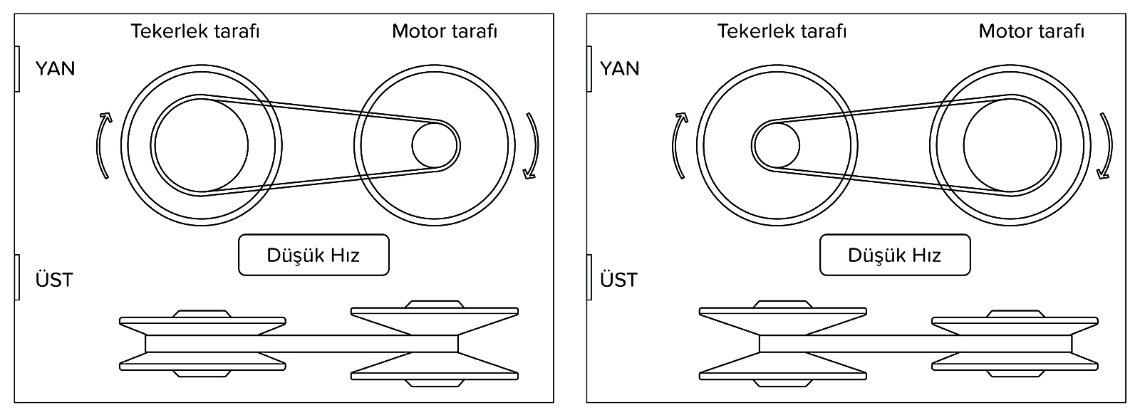 En yüksek kasnak oranı (en büyük viteste), yüksek yağ basıncı tahrik kasnağına (motor tarafı) uygulanırken, tahrik edilen kasnaktaki (tekerlek tarafı) basınç düşürülür. Kasnak çapları şimdi tersine çevrilmiştir, böylece tahrik edilen kasnak, tahrik kasnağından daha hızlı döner.